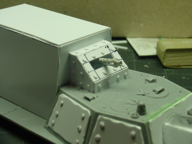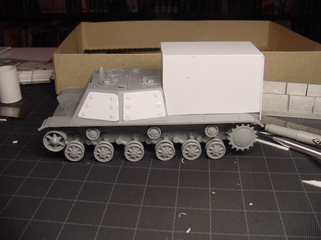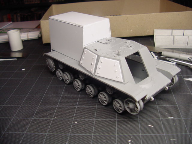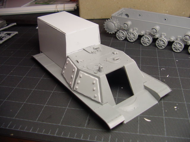 | I assembled the hull and road wheels according to the plans for the original kit. I then added a plasticard superstructure to the rear of the tank. I'm unsure right now if this is a crew-compartment, engine room, or gun deck. It seems awkward and tall at the moment, but I'm hoping to break up the lines by adding stuff to the sides and front. |