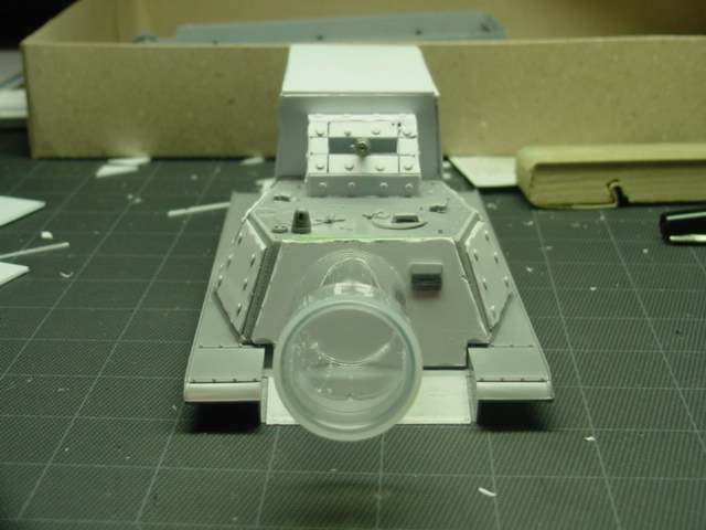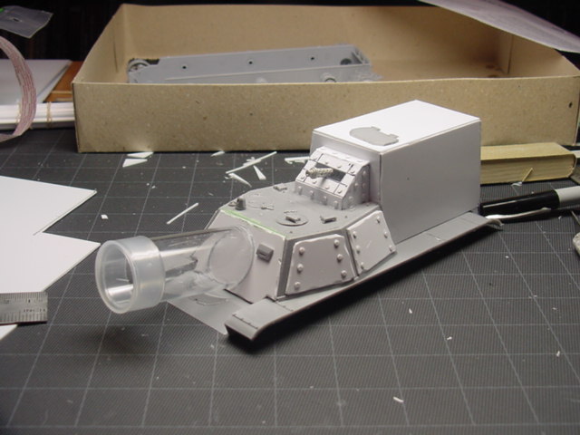 | 8-27-2007 Update: During the last week I beefed up the front glacis plate and mounted the main gun. The aquarium tube worked out well, it was easy to cut with a razor saw and seems to be just about the right size to represent an ork weapon. The glacis plate still needs some rivets and other details. I added a cupola to the front of the rear structure to break up some of the boxy shape and to house a big shoota (representing a heavy bolter). Next up will be a pair of sponson mounted mega-blastas. I'm thinking they will be similar to what beakies use on their land-raiders. |