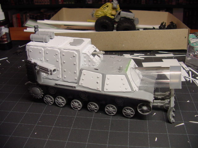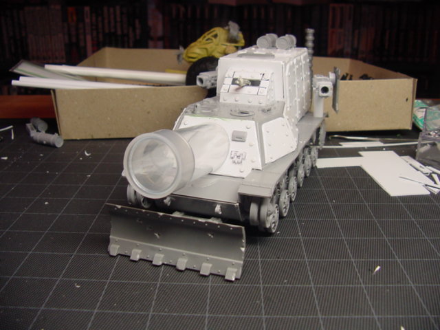 | The front was looking plain, so I added rivets and a skull glyph to the front glacis plate. I also stuck on a dozer blade to help it navigate rough terrain. | ||||||||||||||||||||||||||||||||||||||||||||||