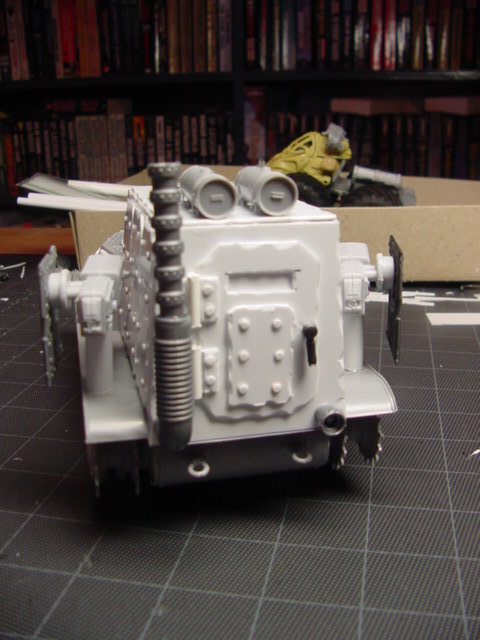 | 8-30-07 Update: I’ve added the sponsons. The kustom mega-blastas are generic enough looking that they can reasonably be proxied for either multi-meltas or plasma cannons. I plan on adding some cabling running from each gun to the small round bit on the lower right-hand side of the rear of the tank. Both guns are mounted so that they swivel through the tank’s side arc, like a beakie land-raider’s lascannons. |