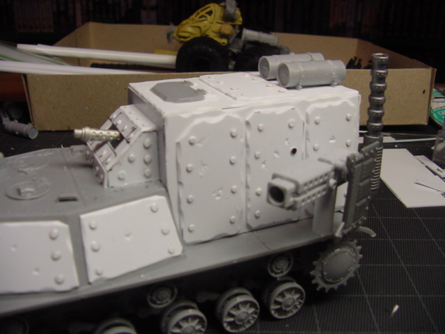 | Started: 8/21/2007 The upcoming release of the new ork codex and the release of Codex Apocalypse has renewed my interest in orks and 40k in general. After a 3 year break from painting any greenskins I've decided to start back up by kitbashing a new armored vehicle for my greenskins. I started this project with an Eastern Express SU-152 I had in the basement and a stack of plasticard. |
