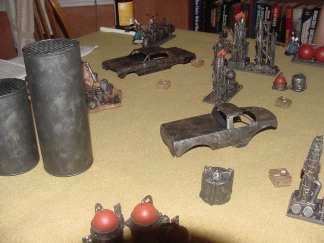 | The stage was set in a trash yard located on the outskirts of Hive Primus. Minions of the shadowy Mutant Liberation Initiative had arranged to smuggle critical machine parts out of the hive by having the crates redirected into the trash. Three of the MLI's operatives: Diego (the hunter with his rifle), Danver (the crippled ig veteran with his trusty lasgun), and Meat (the regenerating brawler) have been sent to the dump to collect the parts. Servants of the Imperial Inquisition have detected the scheme and come to retrieve the parts before they fall into the MLI's hands. Inquisitor Ichiro Kane (a psychic and master swordsman), his mechanized bodyguard SanjonSanjo Mochikune (with combat shotgun and dueling glaive), and his cowardly cogitator Kelwassabe Az (well stocked with a variety of grenades) have arrived hoping to snatch the parts from under the MLI's noses (well, those of them that have noses). The parts are located in one of six identical shipping crates scattered across the junkyard. It will be impossible to determine which crate has the critical parts until after the battle is over and the dust settles, so both sides must act quickly to secure as many crates as possible. | |||||||||||||||||||||||||||||||||||||||||||||||||||