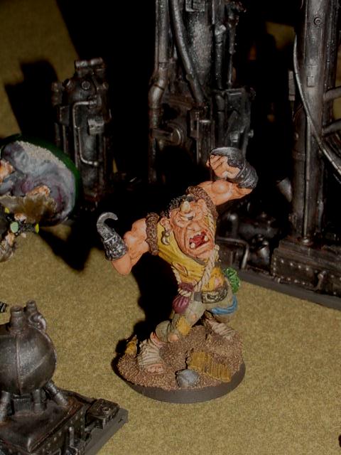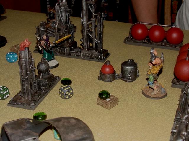 | Kane evades Meat's clumsy rush and draws his sword. His skill as a sword master puts Meat initially on the defensive. Quickly, Meat's right arm is hanging limp and useless from the damage. To Kane's amazement, Meat's flesh begins to reknit itself before his eyes! Az moves out to try to grab a box, chucking a fragmentation grenade at Danver as he did. The grenade flies wide spraying two empty tanks with shrapnel. Danver returns fire with his lasgun clipping Az in the arm and forcing him to retreat behind the trash mound. Sanjo has now recovered and he moves to secure a box of parts while no one is looking. | |||||||||||||||||||||||||||||||||||||||||||||||||||