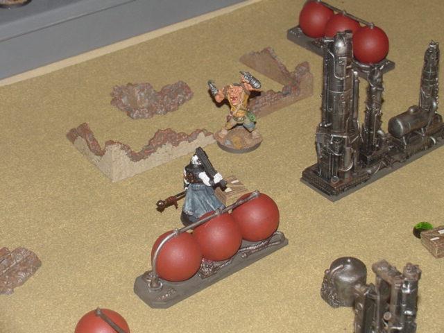 | In the initial turn the two warbands spread out heading for the parts boxes. There were six boxes on the field to retrieve, but only one of them would be the correct box. This would be determined after the fight. The goal was to grab as many as possible and hope that in the end your warband would have the correct box. The Inquisition starts quickly by having Inquisitor Kane grab a box. At the end of the first turn, Kane has seen Danver and Diego has spotted Sanjo. Everyone else (especially Meat) remains oblivious. | |||||||||||||||||||||||||||||||||||||||||||||||||||