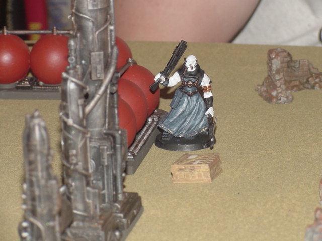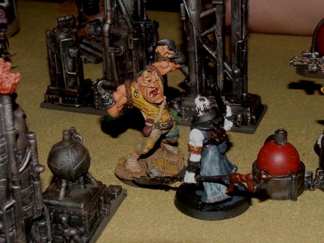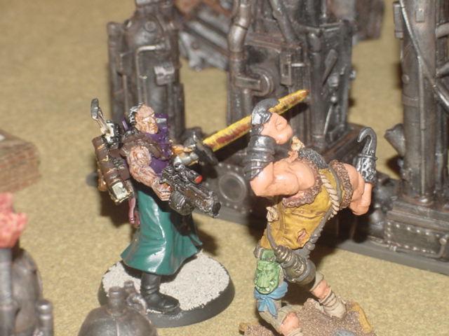 | Kane moves quickly to protect Sanjo by removing him from harms way. A psychic impel lofts Sanjo up and away from Meat. Danver stands up and searches for a shot with his lasgun, finding nothing. Diego repositions to cover Danver's back. Cogitator Az has a bright idea and tries to catch both Danver and Diego in a Choke Gas grenade. Alas, his aim goes awry and the grenade lands in the center of the field. Meat scratches his head in wonderment at the suddenly appearing Inquisitor and the suddenly disappearing Sanjo. Deciding that Kane will do for a new playmate he charges. | |||||||||||||||||||||||||||||||||||||||||||||||||||
