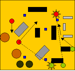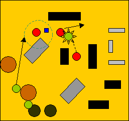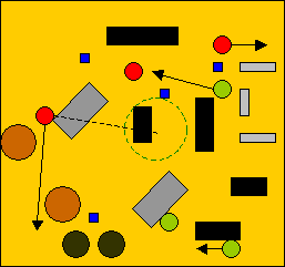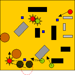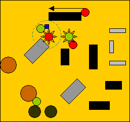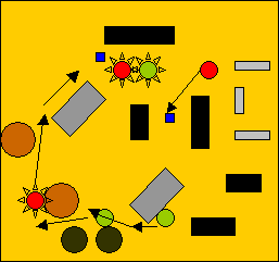 | The action heats up when Kane opens fire with his stubber, hitting Danver in the chest. Then he runs for cover to avoid any counter fire. Wounded, Danver drops to the ground and crawls forward to secure the nearest box. Diego has taken time to line up his shot on Sanjo and CRACK!!! (placed shot to the head). Sanjo is seriously wounded and stunned for three turns. Meat notices a fight has begun and moves to close in on the stunned Sanjo. | |||||||||||||||||||||||||||||||||||||||||||||||||||